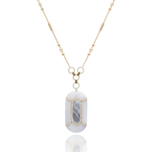 This 18K yellow gold design unfolds along the body with an effortless sense of flow. Luminous mother-of-pearl panels are punctuated by diamonds, creating a gentle rhythm that shifts with movement. Designed to be worn long, it is an expression of elegance defined by softness, warmth, and time.